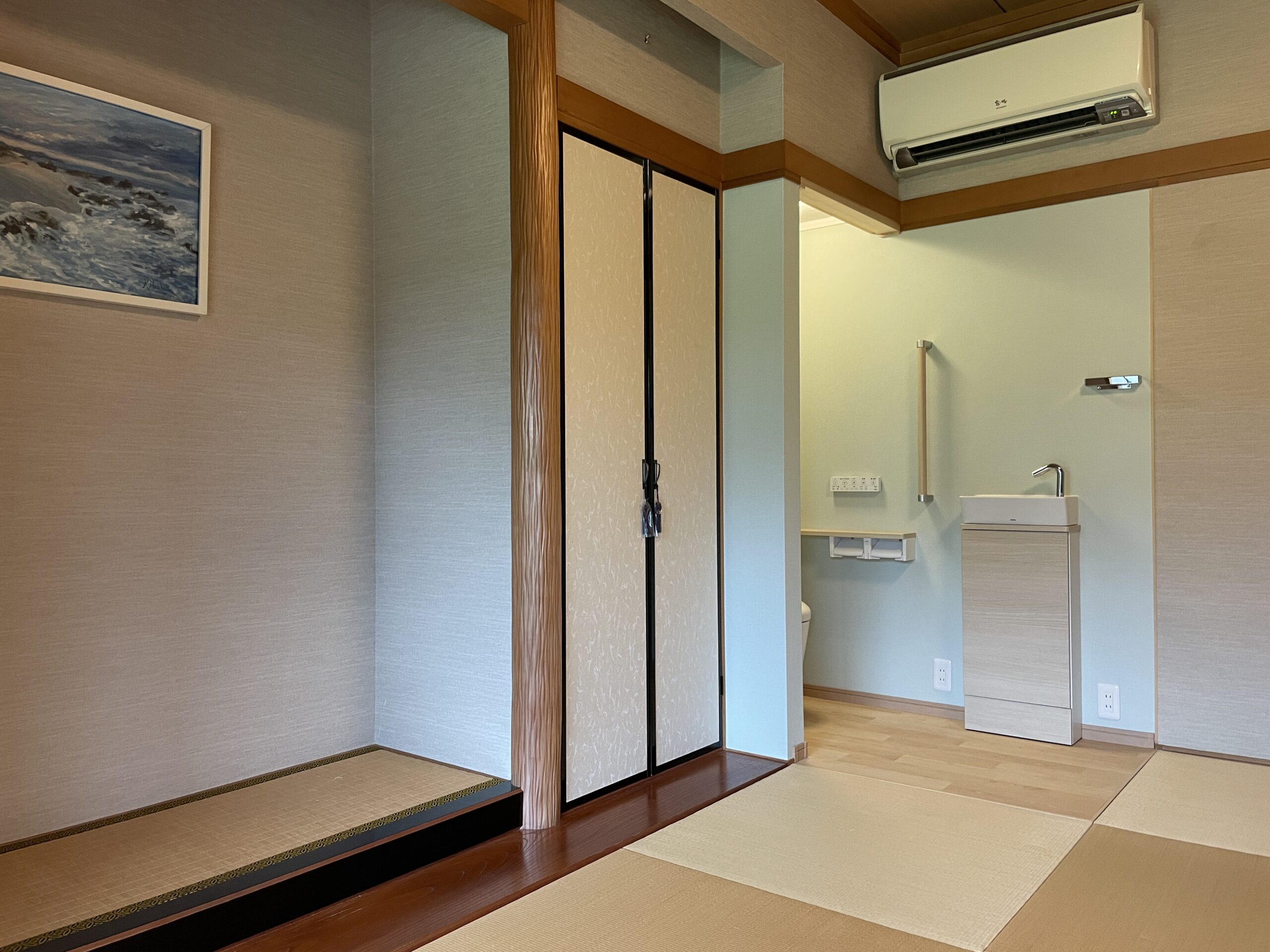 お父様のご負担に考慮し、デイサービスのお時間を中心に施工させていただきました。床と畳境目の足触りや音と匂いを考慮した大建工業の天井材を使用するなど、お施主様と一緒にお父様が快適に使用できて、日ごろのお手入れも安心なTOTOネオレストをご採用いただきました。