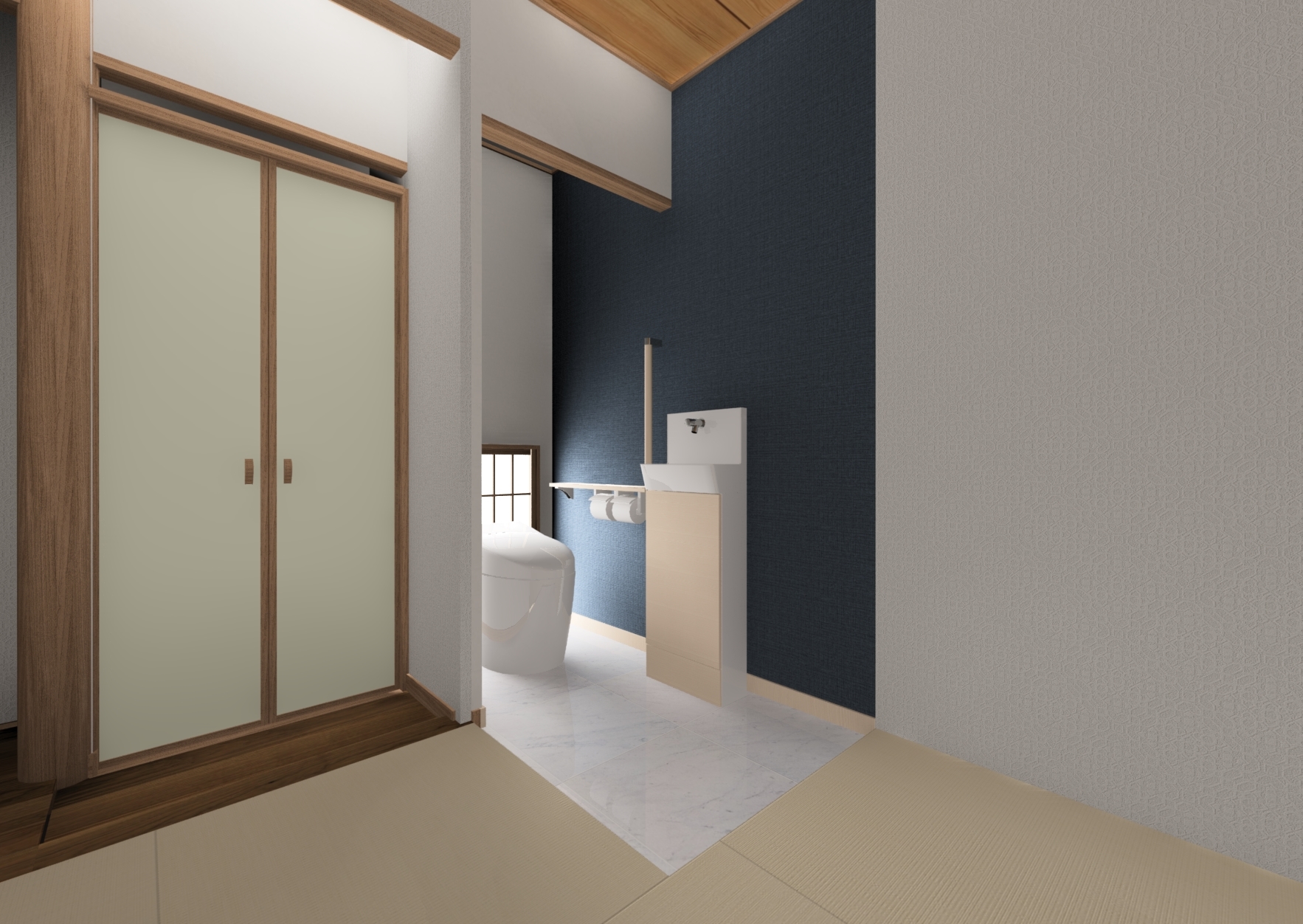 一緒にお住いのご高齢のお父様の和室にトイレを新設したいとのご相談をいただきました。イメージを明確にするためパース制作や排水経路が長くなることによる排水つまりの復旧を容易にするために掃除口を設定するなど、設置後のメンテも考慮した設計をさせて頂きました。